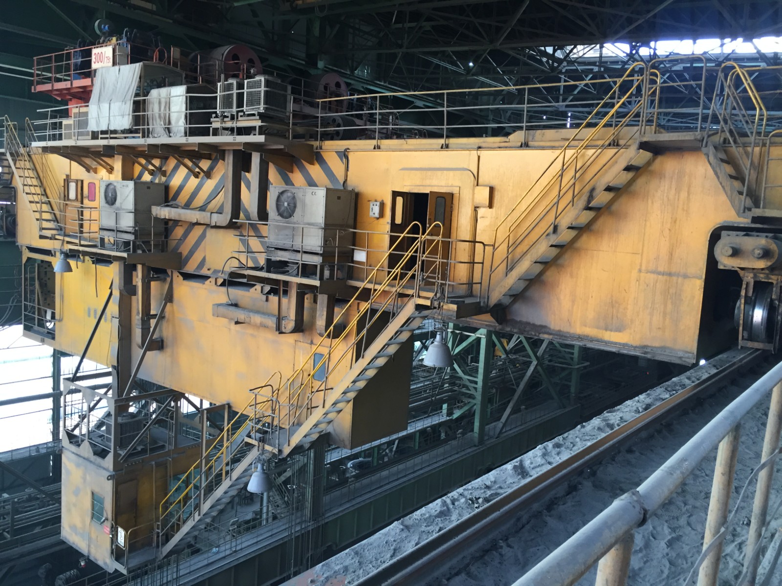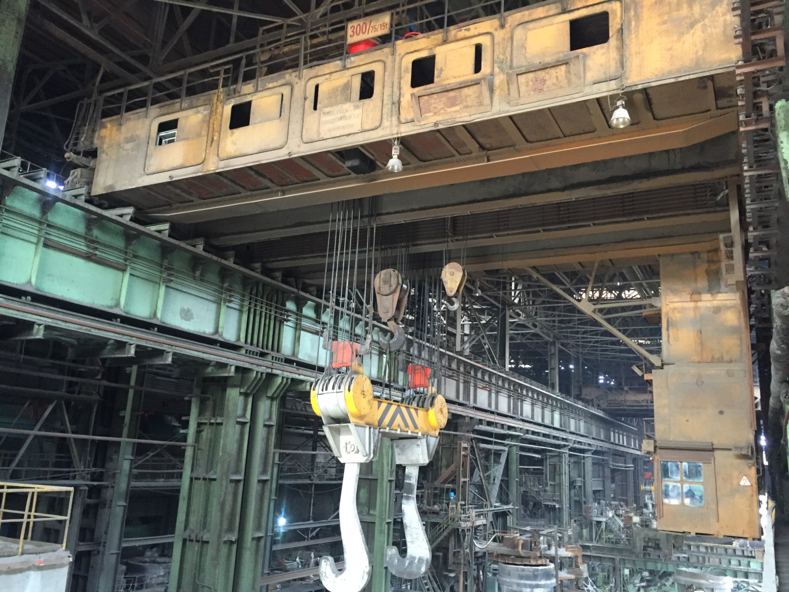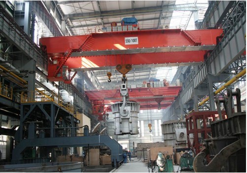 吊钩梁:主钩取物装置为固定间距的吊钩梁,用来吊运钢水包,副钩用来与主钩配合以倾倒钢水、钢渣及其它辅助性吊运作业。