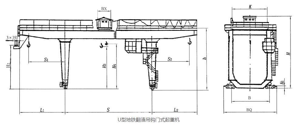 结构组成:由门架、小车、大车运行机构、司机室及电气设备等组成。其中小车装有起升机构、小车运行机构及液压翻转机构。根据倒土方向的不同,支腿结构形式分 A 型和 U 型两种形式。