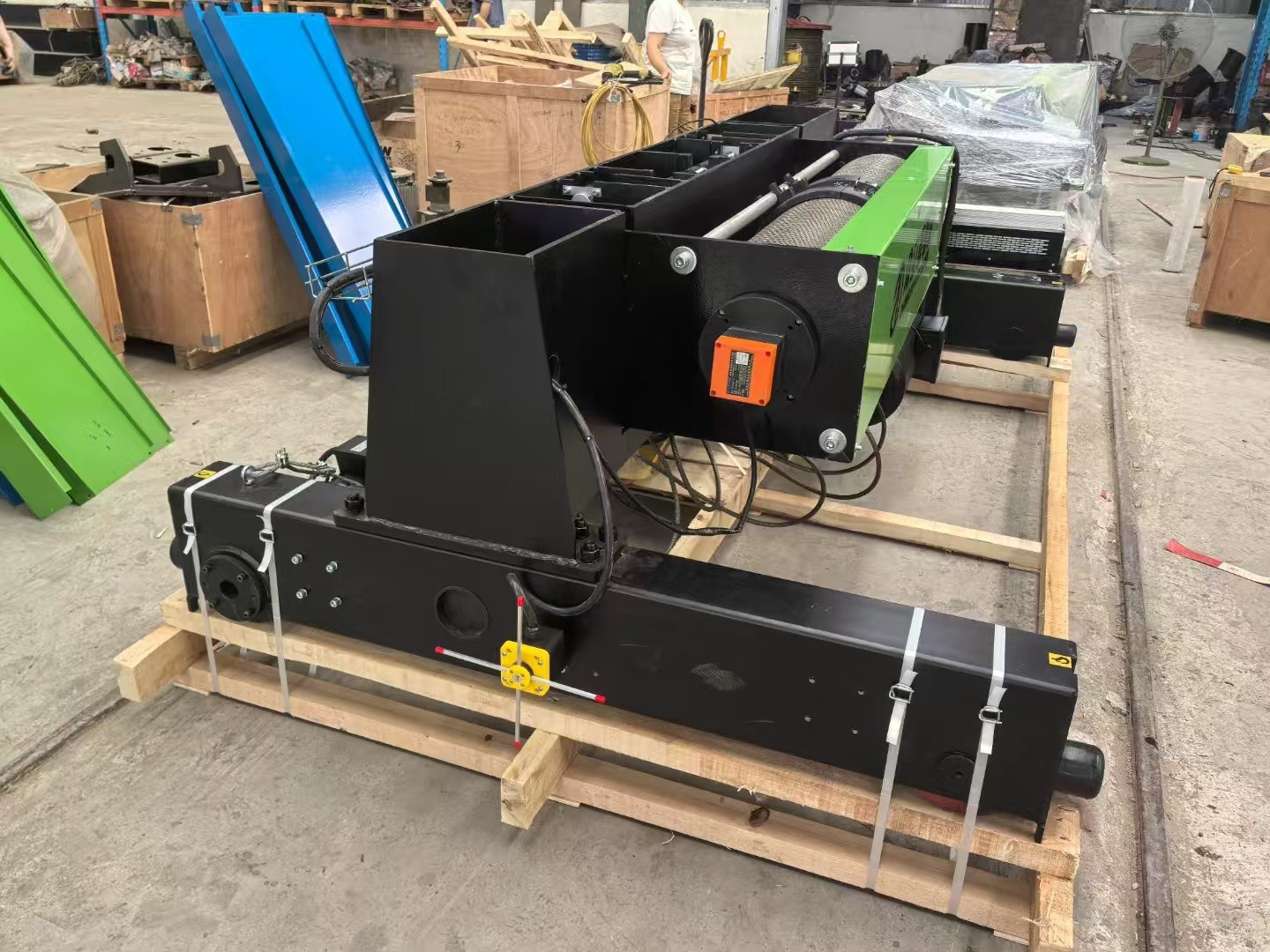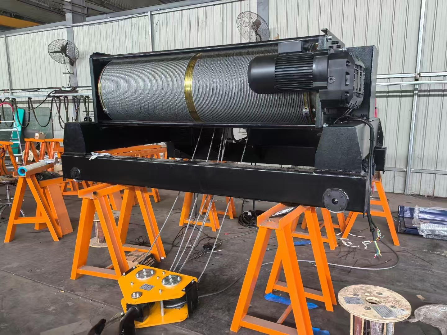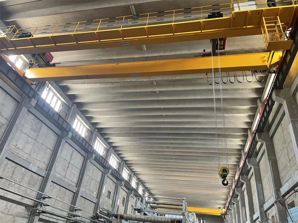 配备 2 台性能高欧式电动葫芦(根据需求可同步或独立运行),起重量通常为 5-50 吨(双葫芦联动可达 100 吨)。葫芦采用变频调速技术,起升速度可在 0.5-10m/min 范围内无级调节,起吊时无冲击;卷筒采用多层缠绕设计,钢丝绳排列整齐,避免乱绳磨损;刹车系统为电磁盘式制动器,响应时间≤0.2 秒,制动精度达 ±2mm。
